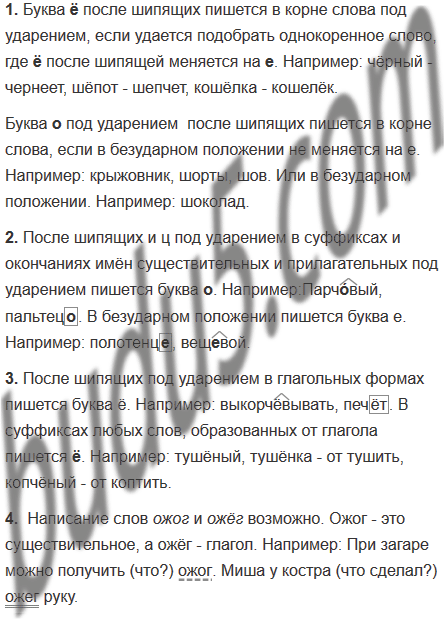 1. При каком условии в корне после шипящих под ударением пишется буква ё, а при каком — буква о? Например:...