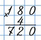 180 • 4 - это 18 дес. • 4. Так как при умножении на ноль любого числа получается 0, то записываем 4 под последней цифрой, отличной от нуля. Дальше выполняю умножение 18 • 4, а ноль переношу сразу в результат.