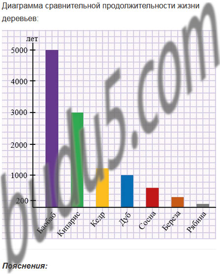 Постройте столбчатую диаграмму сравнительной продолжительности жизни некоторых деревьев по следующим данным: баобаб - 5000 лет, кипарис - 3000 лет, кедр - 1200 лет, дуб - 1000 лет, сосна обыкновенная - 600 лет, береза - 250 лет, рябина - 80 лет.