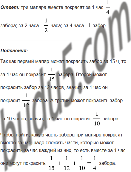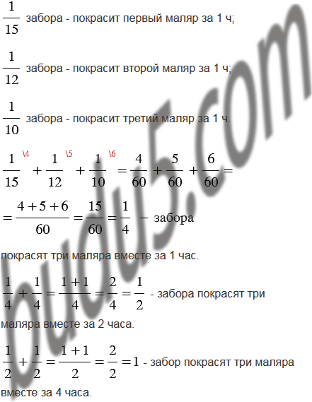 Первый маляр может покрасить забор за 15 ч, второй - за 12 ч, а третий - за 10 ч. Какую часть забора они покрасят вместе за 1 ч? За 2 ч? За 4 ч?