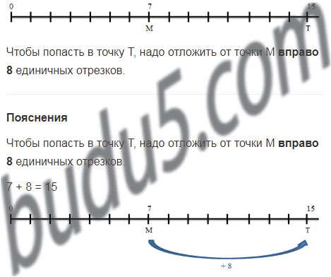 Начертите координатный луч и отметьте на нём точки М(7) и Т(15). Сколько единичных отрезков надо отложить от точки М и в какую сторону, чтобы попасть в точку Т?