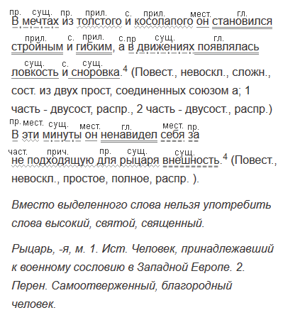 В мечтах из толстого и косолапого он становился (ста́нет) стройным и гибким,  а в движениях (дви́гаться) появлялась ловкость и сноровка.4 Все его недостатки (не употр. без не-) мгновенно пропадали (пропа́л) под блестящими (-блест- без -а-) доспехами.